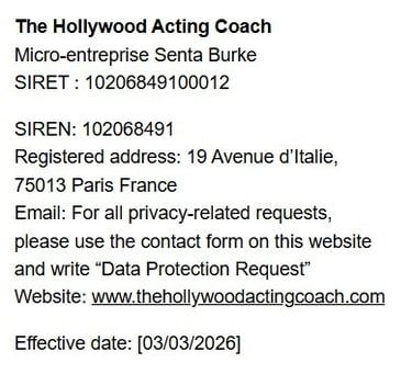 The Hollywood Acting Coach (“we”, “us”, “our”) is committed to protecting your personal data in accordance with the General Data Protection Regulation (EU) 2016/679 (“GDPR”) and applicable French data protection laws.
